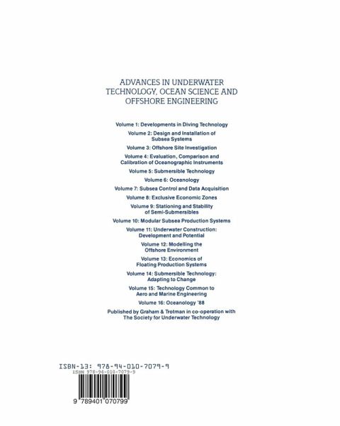 I Navigation and Hydrography.- 1 Starfix: commercial satellite positioning.- 2 A quality control index for swathe sounding data.- 3 The challenge of digital data in hydrography.- 4 New echosounding methods for shallow water and deep sea surveying.- II Oceanography.- 5 The Canadian meteorological buoy network.- 6 Airborne surveys of ocean current and temperature perturbations induce by hurricanes.- 7 Thermal structure and remote sensing measurements in a major frontal region.- 8 A long-term intercomparison of wave sensors in the northern North Sea.- 9 Wave height distributions in shallow water.- 10 Analysis of waves from arrays at Abu Quir and Ras El-Bar.- 11 The influence of changing wind conditions on sea surface residual currents measured by HF radar.- III Techniques and Instrumentation.- 12 Parametric investigations into dynamics of tethered subsea units during launch/recovery operations using model experiments.- 13 Impact of non-linearities on the dynamic behaviour of tension leg platforms.- 14 Fairings for oceanographic cables and instruments:have we yet solved all the problems?.- 15 A new self-contained, multipath-protected acoustic transmission system for the offshore environment.- 16 Real-time, long term communication system for deep ocean instrumentation.- 17 The hydro-optic sensor system (HOSS).- 18 Determination of salinity by an optical wave guide technique.- 19 Measurement of current profiles.- IV Geology, Geophysics, Geotechnics.- 20 Seismic interference, filtering methods and revised noise limits.- 21 A sonar workstation.- 22 Improving the seismic picture: the latest technique.- 23 Offshore drilling and safety: the role of digital high resolution site surveys.- 24 The Ocean Drilling Program.- 25 Measurement of chain geometry in the ground: a comparison of the effects on long and short piled anchors.- 26 The Tyro 86 penetrator experiments at Great Meteor East.- 27 The disposal of heat-generating nuclear waste in deep ocean geological formation: a feasible option.- V Marine Environmental Considerations.- 28 Mathematical modelling of sewage discharges into tidal waters.- 29 The (NERC) North Sea Community Project, 1987¿1992.- 30 Logistic support for the sandfill operations in the Eastern Scheldt tidal basin.- 31 Limitations on offshore environmental monitoring imposed by sea bed sampler design.- 32 Design and use of a clean shipboard handling system for seawater samples.- 33 Some ecological consequences of the use of anti-fouling paints containing tributyltin.- 34 The use of a landfill site for Bunker C collected from a barge aground at Matane, Quebec: a case study.