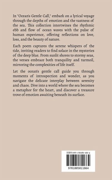 In "Ocean's Gentle Call," embark on a lyrical voyage through the depths of emotion and the vastness of the sea. This collection intertwines the rhythmic ebb and flow of ocean waves with the pulse of human experience, offering reflections on love, loss, and the beauty of nature. Each poem captures the serene whispers of the tide, inviting readers to find solace in the mysteries of the deep blue. From sunlit shores to stormy seas, the verses embrace both tranquility and turmoil, mirroring the complexities of life itself. Let the ocean's gentle call guide you through moments of introspection and wonder, as you navigate the delicate interplay between serenity and chaos. Dive into a world where the sea becomes a metaphor for the heart, and discover a treasure trove of emotion awaiting beneath its surface.