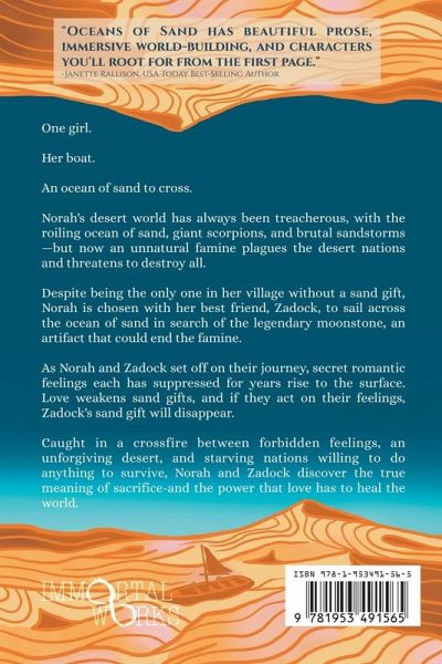 Winner of the 2023 Readers' Favorite book awards for young adult epic fantasy. Love weakens his magic, and survival is far from guaranteed. "Exquisite." - Indies Today "A journey you won't want to return from." - Readers' Favorite ¿One girl. Her boat. An ocean of sand to cross. Norah's desert world has always been treacherous, with the roiling ocean of sand, giant scorpions, and brutal sandstorms-but now an unnatural famine plagues the desert nations and threatens to destroy all. Despite being the only one in her village without a sand gift, Norah is chosen with her best friend, Zadock, to sail across the ocean of sand in search of the legendary moonstone, an artifact that could end the famine. As Norah and Zadock set off on their journey, secret romantic feelings each has suppressed for years rise to the surface. Love weakens sand gifts, and if they act on their feelings, Zadock's sand gift will disappear. Caught in a crossfire between forbidden feelings, an unforgiving desert, and starving nations willing to do anything to survive, Norah and Zadock discover the true meaning of sacrifice-and the power that love has to heal the world.