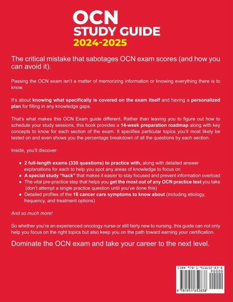 The critical mistake that sabotages OCN exam scores (and how you can avoid it). Do you know the reason why roughly 1 in 4 oncology nurses fails the OCN exam? And why thousands more feel totally unprepared - even after months of prep? It's not the number of practice tests or questions you do. Or whether you have enough experience. Even some of the most seasoned nurses struggle with certain parts of the OCN exam. That's because passing the OCN exam isn't a matter of memorizing information or knowing everything there is to know. It's about knowing what specifically is covered on the exam itself and having a personalized plan for filling in any knowledge gaps. That's what makes this OCN Exam guide different. Rather than leaving you to figure out how to schedule your study sessions, this book provides a 14-week preparation roadmap along with key concepts to know for each section of the exam. It specifies particular topics you'll most likely be tested on and even shows you the percentage breakdown of all the questions by each section. You'll also gain access to special tips and insights for tackling some of the trickier parts of the exam. For example: 2 full-length exams (330 questions) to practice with, along with detailed answer explanations for each to help you spot any areas of knowledge to focus on A special study "hack" that makes it easier to stay focused and prevent information overload The vital pre-practice step that helps you get the most out of any OCN practice test you take (don't attempt a single practice question until you've done this) How to ensure you don't waste your time focusing on the wrong subjects Which aspects of health promotion and disease prevention are likely to show up on the exam Detailed profiles of the 18 cancer care symptoms to know about (including etiology, frequency, and treatment options) Which oncological emergencies are you tested on, and important facts to remember for each one How the ONCC defines the role of the oncology nurse during screening and detection, and which nursing actions are recognized in support of cancer screening The 7 key components of navigating patient care, and how these apply to the overall cancer care plan What to know for each of the different treatment modalities covered on the OCN exam 9 experience-based tips and techniques to help minimize the pain and anxiety of test preparation And much more! This won't provide every question that shows up on the exam. But it provides you with the knowledge to answer almost any question you come across. The strategies inside this book combined with detailed answer keys can help you extract the most out of each practice question. Plus, with the week-by-week "OCN Roadmap," you'll have a simple and easy way to stay on top of your studies. So whether you're an experienced oncology nurse or still fairly new to nursing, this guide can not only help you focus on the right topics but also keep you on the path toward earning your certification. If you're ready to dominate the OCN exam and take your career to the next level, then you need this book today!