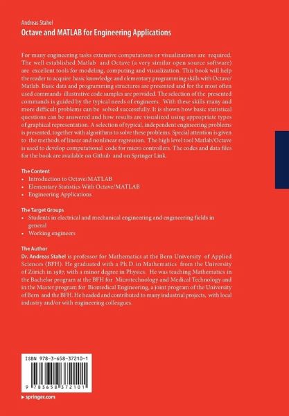 For many engineering tasks extensive computations or visualizations are required. The well established Matlab and Octave (a very similar open source software) are excellent tools for modeling, computing and visualization. This book will help the reader to acquire basic knowledge and elementary programming skills with Octave/Matlab. Basic data and programming structures are presented and for the most often used commands illustrative code samples are provided. The selection of the presented commands is guided by the typical needs of engineers. With these skills many and more difficult problems can be solved successfully. It is shown how basic statistical questions can be answered and how results are visualized using appropriate types of graphical representation. A selection of typical, independent engineering problems is presented, together with algorithms to solve these problems. Special attention is given to the methods of linear and nonlinear regression. The high level tool Matlab/Octave is used to develop computational code for micro controllers. The codes and data files for the book are available on Github and on Springer Link.