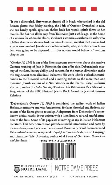 For more than fifty years, Giacomo Debenedetti's October 16, 1943 has been considered one of the best and most accurate accounts of the shockingly brief and efficient roundup of more than one thousand Roman Jews from the oldest Jewish community in Europe for the gas chambers of Auschwitz. Completed a year after the event, Debenedetti's intimate details and vivid glimpses into the lives of the victims are especially poignant because Debenedetti himself was there to witness the event, which forced him and his entire family into hiding. Eight Jews, the companion piece to October 16, 1943, was written in response to testimony about the Ardeatine Cave Massacres of March 24, 1944. In this essay, Debenedetti offers insights into that grisly horror and into assumptions about racial equality. Both of these stunning works are appearing together, along with Alberto Moravia's preface to Debenedetti's October 16, 1943, for the first time in an American translation. October 16, 1943/Eight Jews gives American readers a first glimpse into the extraordinary mind of the man who was Italy's foremost critic of twentieth-century literature. In addition to probing the deeper, haunting questions of the Holocaust, Debenedetti briefly describes the seizure of the Roman Jewish community's library of early manuscripts and incunables, the most valuable Jewish library in all of Italy. Following the roundup, this library was never seen again. Award-winning translator Estelle Gilson offers an additional essay on the history of the library and modern-day attempts to locate it. October 16, 1943/Eight Jews is a moving work that will continue to challenge readers long after they have closed its pages.