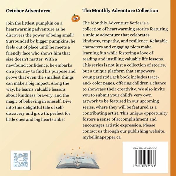 October Adventures Join the littlest pumpkin on a heartwarming adventure as he discovers the power of being small! Surrounded by bigger pumpkins, he feels out of place until he meets a friendly face who shows him that size doesn't matter. With a newfound confidence, he embarks on a journey to find his purpose and prove that even the smallest things can make a big impact. Along the way, he learns valuable lessons about kindness, bravery, and the magic of believing in oneself. Dive into this delightful tale of self-discovery and growth, perfect for little ones and big hearts alike! Unforgettable adventures every month! The Monthly Adventures Series is a collection of heartwarming stories based on specific attributes of each month, designed to delight young readers. Each book features a unique adventure that celebrates kindness, empathy, and resilience. Relatable characters and engaging plots, make learning fun, while fostering a love of reading and instilling valuable life lessons. Guiding young minds: Woven into every adventure are valuable morals and lessons that serve as a guiding light for children as they navigate the complexities of growing up. Perfect for cozy bedtime reading, this enchanting series will capture the hearts of children and adults alike. Perfect for young readers (2 -8 years old). This collection would make a wonderful gift.
