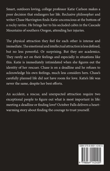 Smart, outdoors loving, college professor Katie Carlson makes a poor decision that endangers her life. Reclusive philosopher and writer Chase Harrington finds Katie unconscious at the bottom of a rocky ravine. He brings her to his secluded cabin in the Cascade Mountains of southern Oregon, attending her injuries. The physical attraction they feel for each other is intense and immediate. The emotional and intellectual attraction is less defined, but no less powerful. Or surprising. But they are academics. They rarely act on their feelings and especially in situations like this. Katie is immediately intimidated when she figures out the identity of her rescuer. Chase is on a deadline and he refuses to acknowledge his own feelings, much less considers hers. Chase's carefully planned life did not have room for love. Katie's life was never the same, despite her best efforts. An accident, a rescue, and unexpected attraction require two exceptional people to figure out what is most important in life: meeting a deadline or finding love? October Falls delivers a heart-warming story about finding the courage to trust yourself.