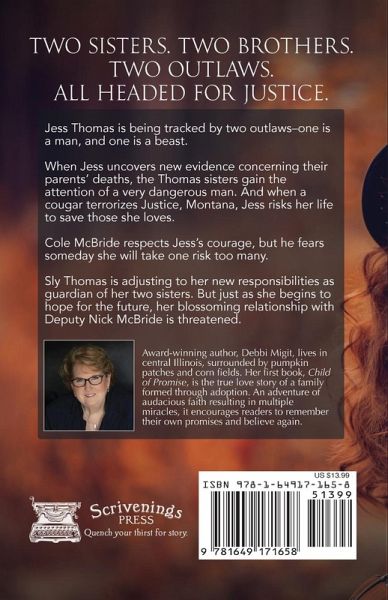 Two sisters. Two brothers. Two Outlaws. All headed for Justice. Jess Thomas is being tracked by two outlaws-one is a man, and one is a beast. When Jess uncovers new evidence concerning their parents' deaths, the Thomas sisters gain the attention of a very dangerous man. And when a cougar terrorizes Justice, Montana, Jess risks her life to save those she loves. Cole McBride respects Jess's courage, but he fears someday she will take one risk too many. Sly Thomas is adjusting to her new responsibilities as guardian of her two sisters. But just as she begins to hope for the future, her blossoming relationship with Deputy Nick McBride is threatened.