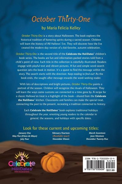 October Thirty-One is a story about Halloween. The book explores the historical tradition of honoring spirits during a sacred season. Children will learn the history of All Hallows' Eve. They will discover how the Eve created the modern-day version of a kid-favorite, autumn celebration. October Thirty-One is the second title of the Celebrate the HoliDates® children's book series. The books are fun and information-packed stories told from a child's point of view. Each title in the collection is colorfully illustrated. Readers engage with playful text and vibrant pictures. A fun and simple…mehr