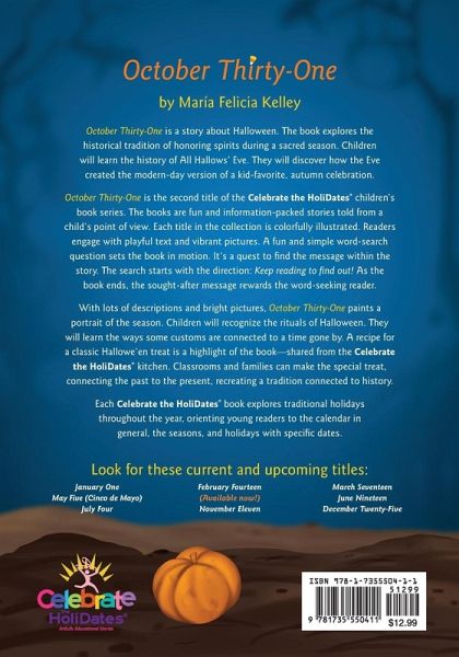 October Thirty-One is a story about Halloween. The book explores the historical tradition of honoring spirits during a sacred season. Children will learn the history of All Hallows' Eve. They will discover how the Eve created the modern-day version of a kid-favorite, autumn celebration. October Thirty-One is the second title of the Celebrate the HoliDates® children's book series. The books are fun and information-packed stories told from a child's point of view. Each title in the collection is colorfully illustrated. Readers engage with playful text and vibrant pictures. A fun and simple…mehr
