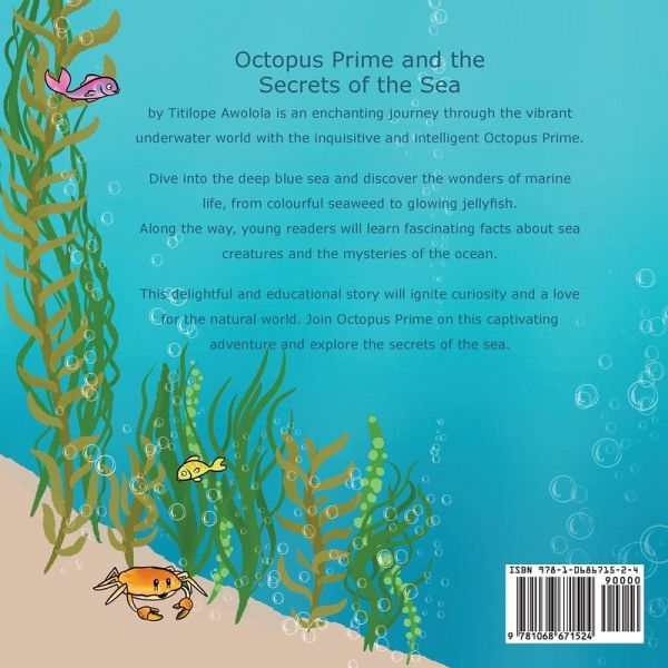Dive into an underwater adventure with Octopus Prime! Join the inquisitive and intelligent Octopus Prime as he takes young readers on an exciting journey through the deep blue sea. Along the way, children will discover fascinating marine creatures, from glowing jellyfish to sneaky snails, while learning fun and surprising facts about the ocean. With rhythmic storytelling, engaging repetition, and vibrant illustrations, this book captures the magic of the ocean and encourages curiosity about the natural world. Octopus Prime and the Secrets of the Sea is the perfect read-aloud story for parents, educators, and little explorers eager to uncover the mysteries of marine life. A delightful book for anyone who loves ocean adventures, fun facts, and playful storytelling!