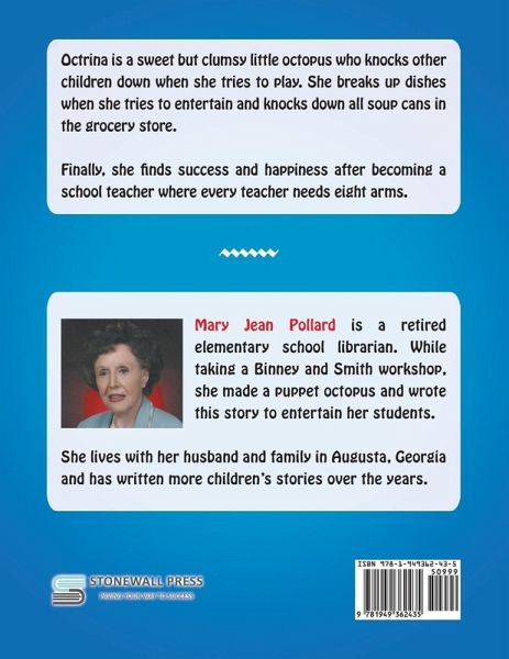 Octrina is a sweet but clumsy little octopus who knocks other children down when she tries to play. She breaks up dishes when she tries to entertain and knocks down all soup cans in the grocery store. Finally, she finds success and happiness after becoming a school teacher where every teacher needs eight arms.