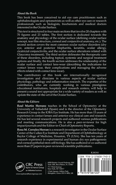 This book has been conceived to aid eye care practitioners such as ophthalmologists and optometrists as well as other eye care or research professionals such as biologists, biochemists and medical doctors interested in the Ocular Surface. This text is divided into four main sections. The first section is dedicated towards the anatomy and physiology of the ocular surface (defining ocular surface concept, tear film structure, corneal and conjunctival anatomy, etc.). The second section covers the most common ocular surface disorders (dry eye, anterior and posterior blepharitis, keratitis, ocular allergy, cicatricial conjunctivitis, and the ocular surface alterations related with Glaucoma treatment). The third section delineates the therapeutic care of these disorders, including topical, systemic and surgical treatment options and the fourth section addresses the relationship of the ocular surface and contact lenswear (describing the indications for contact lenses wear, their complications and managing the adverse effects related with contact lens-wear).