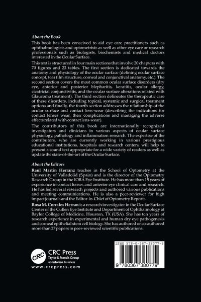 Anatomy and Physiology of the Ocular Surface: Definition of the Ocular Surface. The Human Tear Film. Comparative Anatomy and Physiology of the Cornea and Conjunctiva. Ocular Surface Disorders: Dry Eye. Anterior and Posterior Blepharitis. Keratitis. Ocular Allergy. Cicatricial Conjunctivitis. Ocular Surface and Glaucoma. Care of Ocular Surface Disorders: Pathogenesis and Treatment of Dry Eye Syndrome. Management of Keratitis. Management of Ocular Allergy. Management of Cicatricial Conjunctivitis. Management Approach of Limbal Stem Cell Deficiency. Ocular Surface Reconstruction. Ocular Surface and Contact Lens: Contact Lenses Definitions. Contact Lens induced Ocular Surface Alterations. Therapeutic use of Contact Lenses. The Tear Film Interaction with Contact Lenses. Contact Lens Care Solutions and Ocular Surface.