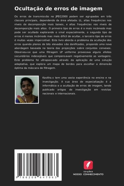 Os erros de transmissão no JPEG2000 podem ser agrupados em três classes principais, dependendo da área afetada: LL, altas frequências nos níveis de decomposição mais baixos, e altas frequências nos níveis de decomposição mais altos. O primeiro tipo de erros é o mais incómodo mas pode ser ocultado explorando o sinal espacialmente, o segundo tipo de erros é menos incómodo mas mais difícil de ocultar, o terceiro tipo de erros é muitas vezes impercetível. Este livro aborda o problema da ocultação dos erros quando planos de bits elevados são danificados, propondo uma nova abordagem baseada na teoria das projecções sobre conjuntos convexos. Observou-se que uma filtragem LP uniforme provocava alguns efeitos secundários indesejáveis que compensavam negativamente as vantagens. Este problema foi ultrapassado através da aplicação de uma solução adaptativa, que explora um mapa de bordos para escolher a dimensão óptima da máscara de filtragem.