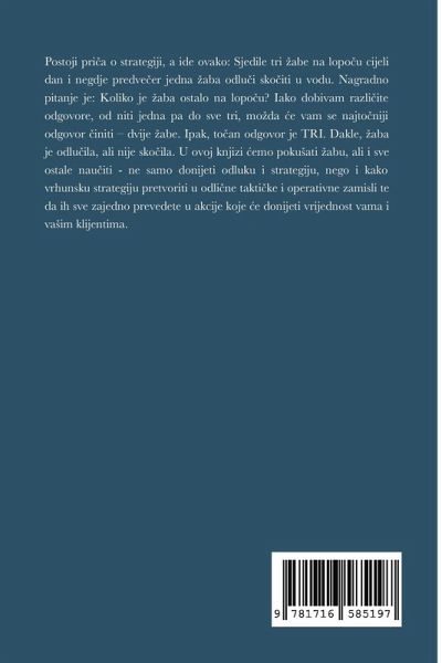Postoji pri¿a o strategiji, a ide ovako: Sjedile tri abe na lopöu cijeli dan i negdje predve¿er jedna aba odlu¿i sköiti u vodu. Nagradno pitanje je: Koliko je aba ostalo na lopöu? Iako dobivam razli¿ite odgovore, od niti jedna pa do sve tri, moda ¿e vam se najtöniji odgovor ¿initi - dvije abe. Ipak, töan odgovor je TRI. Dakle, aba je odlu¿ila, ali nije sköila. U ovoj knjizi ¿emo pokuati abu, ali i sve ostale nau¿iti - ne samo donijeti odluku i strategiju, nego i kako da vrhunsku strategiju pretvorite u odli¿ne takti¿ke i operativne zamisli te da ih sve zajedno prevedete u akcije koje ¿e donijeti vrijednost vama i vaim klijentima.