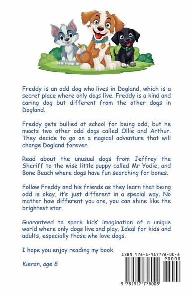 Freddy is an odd dog who lives in Dogland, which is a secret place where only dogs live. Freddy is a kind and caring dog but different from the other dogs in Dogland. Freddy gets bullied at school for being odd, but he meets two other odd dogs called Ollie and Arthur. They decide to go on a magical adventure that will change Dogland forever. Read about the unusual dogs from Jeffrey the Sheriff to the wise little puppy called Mr Yodie, and Bone Beach where dogs have fun searching for bones. Follow Freddy and his friends as they learn that being odd is okay, it's just different in a special way. No matter how different you are, you can shine like the brightest star. Guaranteed to spark kids' imagination of a unique world where only dogs live and play. Ideal for kids and adults, especially those who love dogs. I hope you enjoy reading my book. Kieran, age 8