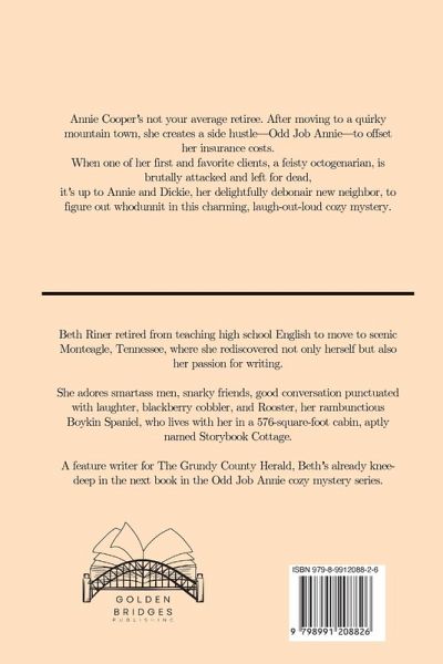 Annie Cooper's not your average retiree. After moving to a quirky mountain town, she creates a side hustle-Odd Job Annie-to offset her insurance costs. When one of her first and favorite clients, a feisty octogenarian, is brutally attacked and left for dead, it's up to Annie and Dickie, her delightfully debonair new neighbor, to figure out whodunnit in this charming, laugh-out-loud cozy mystery.
