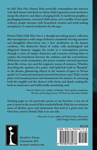 In Odd Man Out, Dennis Daly poetically contemplates the universe with dark humor and dead-on clarity. Daly's quantum word-mechanics merge the observer and object, changing both. A murderous prophet, a gunslinging lawman, venerated child-saints, and a medley of not quite ordinary people intermix with formalized creation and myth-making metaphysics. A musical meditation for the ages. Dennis Daly's Odd Man Out is a thought-provoking poetry collection that encompasses a wide range of themes, seamlessly weaving narrative and thoughtful observation into a lyric meditation on the human condition. His distinctive blend of reality with mythological and allegorical elements engages the reader in a contemplative journey through a series of unique characters and scenarios, inviting them to explore the boundaries between the ordinary and the extraordinary. With keen social commentary, the poems examine essential questions about life, virtue, vice, and the enigmatic nature of existence. Whether describing the opulence of a palace with "gold-leaf roofs in Thimphu" or the distant, glimmering objects in the vastness of space as "frozen sparks" or"a universal waterspout inverted into heavy rain," Daly's words paint vivid mental pictures and demonstrate his mastery in conveying both the tangible and the abstract with clarity and depth, making the book an immersive and intellectually stimulating read. -Philip Nikolayev, author of Monkey Time and his translation, The Star of Dazzling Ecstasy: 79 Poems by Alexander Pushkin Marking pages to cite particular poems as my favorites, I ran out of post-it notes in the reread of this wonderful book. Daly has an eximious sense of rhythm, pace, and momentum that lead to a great read. Jan Oort fans, rejoice: Dennis Daly is on our side. -Michael Casey, author of Check Points, Obscenities (Yale Younger Poets), and Millrat