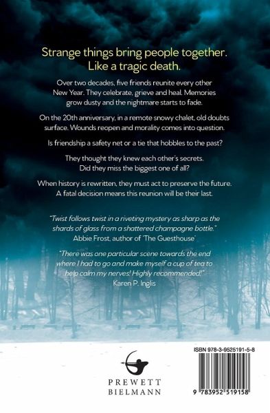 The Guilty Party meets The Secret History In every group of friends, each has a role. The mother, the dad, the big brother and little sister. All except Gael. The outsider. The one who wasn't there when it happened. Dhan was the jester of the group, until the night he disappeared, taking part of their future with him. Every other New Year's Eve, they gather to remember Dhan's death and to celebrate their friendship. But what if that friendship is built on a lie? Gael's a journalist. Her instinct is to seek out the truth. Two decades later, it's her turn to organise their reunion. In a snowy chalet on New Year's Eve, Gael starts asking questions. She wants to know what really happened that night. Old wounds reopen and a dark secret comes to light, sending a shockwave through their lives. Truth comes at a price. "Twist follows twist in a riveting mystery as sharp as the shards of glass from a shattered champagne bottle." Abbie Frost, author of 'The Guesthouse'