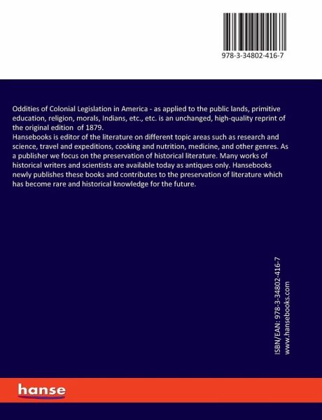 Oddities of Colonial Legislation in America - as applied to the public lands, primitive education, religion, morals, Indians, etc., etc. is an unchanged, high-quality reprint of the original edition of 1879.Hansebooks is editor of the literature on different topic areas such as research and science, travel and expeditions, cooking and nutrition, medicine, and other genres. As a publisher we focus on the preservation of historical literature. Many works of historical writers and scientists are available today as antiques only. Hansebooks newly publishes these books and contributes to the preservation of literature which has become rare and historical knowledge for the future.
