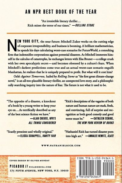 New York City, the near future: Mitchell Zukor works on the cutting edge of corporate irresponsibility, and business is booming. A brilliant mathematician, he spends his days calculating worst-case scenarios for FutureWorld, a consulting firm that indemnifies corporations against potential disasters. As Mitchell immerses himself in the calculus of catastrophe, he exchanges letters with Elsa Bruner-a college crush with her own apocalyptic secret-and becomes obsessed by a culture's fears. When Mitchell's darkest predictions come true and an actual worst-case scenario engulfs Manhattan, he realizes that he is uniquely prepared to profit. But what will it cost him? Odds Against Tomorrow, hailed by Rolling Stone as "the first great climate-change novel," is an all-too-plausible literary thriller, an unexpected love story, and a philosophically searching inquiry into the nature of fear. The future is not what it used to be.