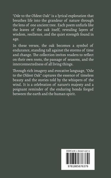 "Ode to the Oldest Oak" is a lyrical exploration that breathes life into the grandeur of nature through the lens of one ancient tree. Each poem unfurls like the leaves of the oak itself, revealing layers of wisdom, resilience, and the quiet strength found in age. In these verses, the oak becomes a symbol of endurance, standing tall against the storms of time and change. The collection invites readers to reflect on their own roots, the passage of seasons, and the interconnectedness of all living things. Through rich imagery and evocative language, "Ode to the Oldest Oak" captures the essence of timeless beauty and the stories told by the whispers of the wind. It is a celebration of nature's majesty and a poignant reminder of the enduring bonds forged between the earth and the human spirit.
