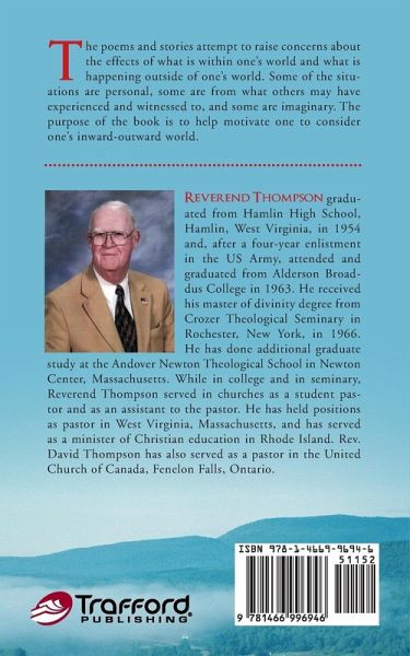 The poems and stories attempt to raise concerns about the effects of what is within one's world and what is happening outside of one's world. Some of the situations are personal, some are from what others may have experienced and witnessed to, and some are imaginary. The purpose of the book is to help motivate one to consider one's inward-outward world.