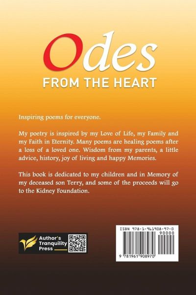 Inspiring poems for everyone. My poetry is inspired by my Love of Life, my Family and my Faith in Eternity. Many poems are healing poems after a loss of a loved one. Wisdom from my parents, a little advice, history, joy of living and happy Memories. This book is dedicated to my children and in Memory of my deceased son Terry, and some of the proceeds will go to the Kidney Foundation.