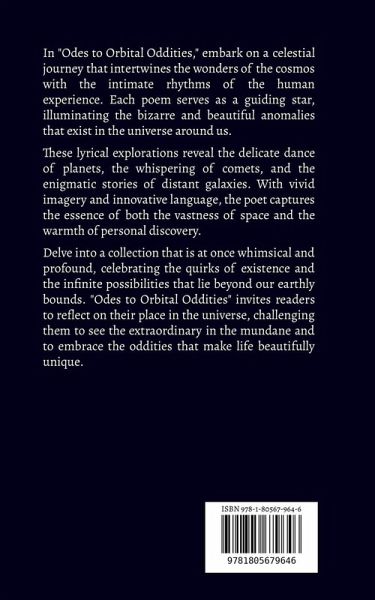 In "Odes to Orbital Oddities," embark on a celestial journey that intertwines the wonders of the cosmos with the intimate rhythms of the human experience. Each poem serves as a guiding star, illuminating the bizarre and beautiful anomalies that exist in the universe around us. These lyrical explorations reveal the delicate dance of planets, the whispering of comets, and the enigmatic stories of distant galaxies. With vivid imagery and innovative language, the poet captures the essence of both the vastness of space and the warmth of personal discovery. Delve into a collection that is at once whimsical and profound, celebrating the quirks of existence and the infinite possibilities that lie beyond our earthly bounds. "Odes to Orbital Oddities" invites readers to reflect on their place in the universe, challenging them to see the extraordinary in the mundane and to embrace the oddities that make life beautifully unique.