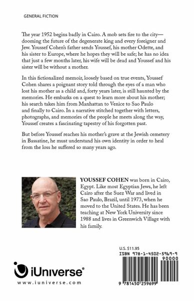 The year 1952 begins badly in Cairo. A mob burns every building in the city-dooming the future of the degenerate king and every foreigner and Jew. Youssef Cohen's father sends Youssef, his mother Odette, and his sister to Europe, where he hopes they will be safe; he has no idea that just a few months later, his wife will be dead and Youssef and his sister will be without a mother. In this fictionalized memoir, loosely based on true events, Youssef Cohen shares a poignant story told through the eyes of a man who lost his mother as a child and, forty years later, is still haunted by the memories. He embarks on a quest to learn more about his mother; his search takes him from Manhattan to Venice to Sao Paolo and finally to Cairo. In a narrative stitched together with letters, photographs, and memories of the people he meets along the way, the man creates a fascinating tapestry of his forgotten past. But before the man reaches his mother's grave at a Jewish cemetery in Bassatine, he must understand his own identity in order to heal from the loss he suffered so many years ago.