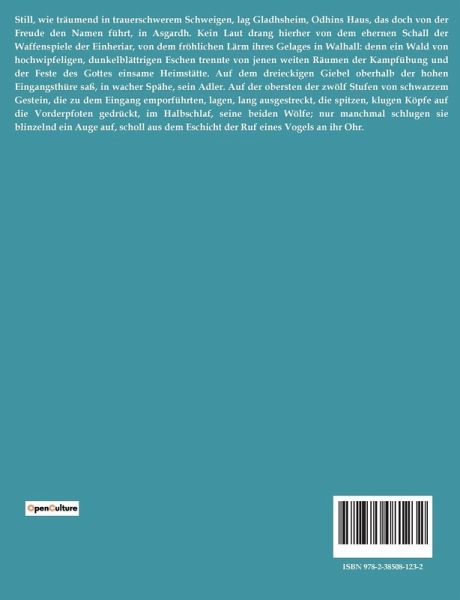 Still, wie träumend in trauerschwerem Schweigen, lag Gladhsheim, Odhins Haus, das doch von der Freude den Namen führt, in Asgardh. Kein Laut drang hierher von dem ehernen Schall der Waffenspiele der Einheriar, von dem fröhlichen Lärm ihres Gelages in Walhall: denn ein Wald von hochwipfeligen, dunkelblättrigen Eschen trennte von jenen weiten Räumen der Kampfübung und der Feste des Gottes einsame Heimstätte. Auf dem dreieckigen Giebel oberhalb der hohen Eingangsthüre saß, in wacher Spähe, sein Adler. Auf der obersten der zwölf Stufen von schwarzem Gestein, die zu dem Eingang emporführten, lagen, lang ausgestreckt, die spitzen, klugen Köpfe auf die Vorderpfoten gedrückt, im Halbschlaf, seine beiden Wölfe; nur manchmal schlugen sie blinzelnd ein Auge auf, scholl aus dem Eschicht der Ruf eines Vogels an ihr Ohr.