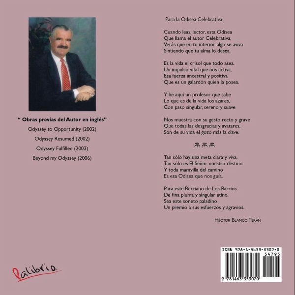 Para la Odisea Celebrativa Cuando leas, lector, esta Odisea Que llama el autor Celebrativa, Verás que en tu interior algo se aviva Sintiendo que tu alma lo desea. Es la vida el crisol que todo asea, Un impulso vital que nos activa, Esa fuerza ancestral y positiva Que es un galardón quien la posea. Y he aquí un profesor que sabe Lo que es de la vida los azares, Con paso singular, sereno y suave Nos muestra con su gesto recto y grave Que todas las desgracias y avatares, Son de su vida el gozo más la clave. ooo 0 ooo Tan sólo hay una meta clara y viva, Tan sólo es El Señor nuestro destino Y toda maravilla del camino Es esa Odisea que nos guía. Para este Berciano de Los Barrios De fina pluma y singular atino, Sea este soneto paladino Un premio a sus esfuerzos y agravios. Héctor Blanco Terán