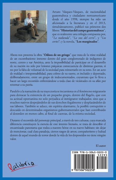 Ahora nos presenta la obra "Odisea de un gringo" que trata de la triste realidad de un excombatiente inmerso dentro del gran conglomerado de indigentes de norte, centro y sur América, ante la imposibilidad de participar en el desarrollo de su nación no solo por lesiones psíquicas consecuencia de distintas guerras, si no por la falta de voluntad de la sociedad para reinsertarlo en su seno. En un acto de maldad e irresponsabilidad, para colmo de su suerte, es incluido y deportado, deliberadamente, entre un grupo de indocumentados, coyuntura que lo lleva a hacer un largo recorrido enfrentándose a toda clase de vicisitudes en su afán por retornar a su patria. Paralelo a la narración de su trayectoria se incursiona en el fenómeno migratorio para destacar la existencia de un pequeño grupo, dentro del flagelo, que con su actitud oportunista no solo perjudica al inmigrante trabajador, sino que a muchos nativos despojándoles de sus derechos ilegalmente y desplazándoles de sus labores. También se aduce, sin espíritu alarmante, la posible corrupción o descuido en determinados organismos gubernamentales que han contribuido al desorden en menos cabo, al final de cuentas, de la misma sociedad. Durante el recorrido del personaje principal, a través de tres culturas, cuya marcada diferencia constituyen la esencia de este intento literario, se trata de describir el encarnizado panorama que rodea a nuestro héroe en su nuevo habítate; sin dejar de mencionar, cual clara paradoja, ciertos rasgos de amor, compañerismo y lealtad dentro de aquel mundo de terror donde la vida de los desposeídos no tiene ningún valor. El autor