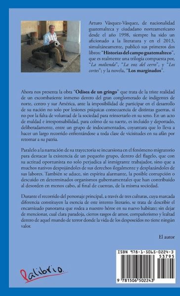 Ahora nos presenta la obra "Odisea de un gringo" que trata de la triste realidad de un excombatiente inmerso dentro del gran conglomerado de indigentes de norte, centro y sur América, ante la imposibilidad de participar en el desarrollo de su nación no solo por lesiones psíquicas consecuencia de distintas guerras, si no por la falta de voluntad de la sociedad para reinsertarlo en su seno. En un acto de maldad e irresponsabilidad, para colmo de su suerte, es incluido y deportado, deliberadamente, entre un grupo de indocumentados, coyuntura que lo lleva a hacer un largo recorrido enfrentándose a toda clase de vicisitudes en su afán por retornar a su patria. Paralelo a la narración de su trayectoria se incursiona en el fenómeno migratorio para destacar la existencia de un pequeño grupo, dentro del flagelo, que con su actitud oportunista no solo perjudica al inmigrante trabajador, sino que a muchos nativos despojándoles de sus derechos ilegalmente y desplazándoles de sus labores. También se aduce, sin espíritu alarmante, la posible corrupción o descuido en determinados organismos gubernamentales que han contribuido al desorden en menos cabo, al final de cuentas, de la misma sociedad. Durante el recorrido del personaje principal, a través de tres culturas, cuya marcada diferencia constituyen la esencia de este intento literario, se trata de describir el encarnizado panorama que rodea a nuestro héroe en su nuevo habítate; sin dejar de mencionar, cual clara paradoja, ciertos rasgos de amor, compañerismo y lealtad dentro de aquel mundo de terror donde la vida de los desposeídos no tiene ningún valor. El autor