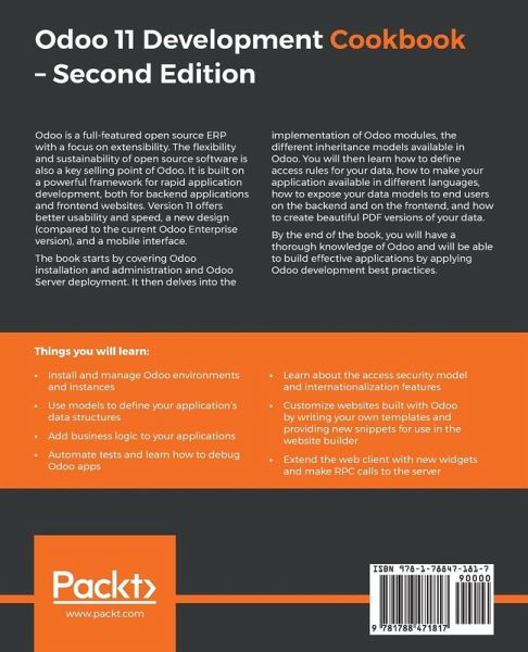 Create fast and efficient server-side applications using the latest features of Odoo v11 Key FeaturesGet the most up-to-date guide on Odoo 11 to create custom and reusable modules Interconnect your application with other systems by implementing web APIs Understand the mechanisms powering the Odoo framework to build robust enterprises Book Description Odoo is a full-featured open source ERP with a focus on extensibility. The flexibility and sustainability of open source are also a key selling point of Odoo. It is built on a powerful framework for rapid application development, both for back-end applications and front-end websites. Version 11 offers better usability and speed: a new design (as compared to the current Odoo Enterprise version) and a mobile interface. The book starts by covering Odoo installation and administration and Odoo Server deployment. It then delves into the implementation of Odoo modules, the different inheritance models available in Odoo. You will then learn how to define access rules for your data; how to make your application available in different languages; how to expose your data models to end users on the back end and on the front end; and how to create beautiful PDF versions of your data. By the end of the book, you will have a thorough knowledge of Odoo and will be able to build effective applications by applying Odoo development best practices What you will learnInstall and manage Odoo environments and instances Use models to define your application's data structures Add business logic to your applications Add automated tests and learn how to debug Odoo apps Learn about the access security model and internationalization features Customize websites built with Odoo, by writing your own templates and providing new snippets for use in the website builder Extend the web client with new widgets and make RPC calls to the server Who this book is for: ¿If you're a Python developer and want to develop highly efficient business applications with the latest Odoo framework (or if you just want a hands on problem solution book for all your Odoo Development related issues), this book is for you! Some experience with the JavaScript programming language and web development is required to get the most out of this book.