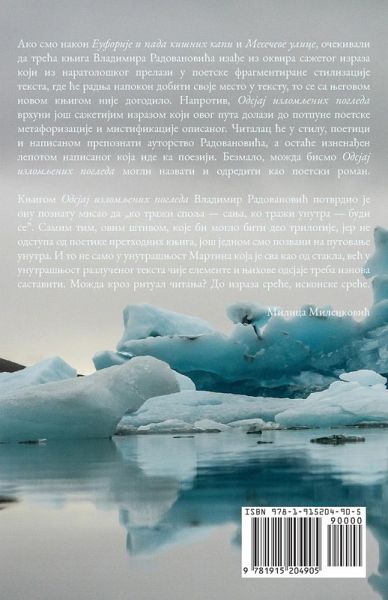 Ako smo nakon "Euforije i pada kisnih kapi" i "Meseceve ulice", ocekivali da treca knjiga Vladimira Radovanovica izadje iz okvira sazetog izraza koji iz naratoloskog prelazi u poetske fragmentirane stilizacije teksta, gde ce radnja napokon dobiti svoje mesto u tekstu, to se sa njegovom novom knjigom nije dogodilo. Naprotiv, "Odsjaj izlomljenih pogleda" vrhuni jos sazetijim izrazom koji ovog puta dolazi do potpune poetske metaforizacije i mistifikacije opisanog. Citalac ce u stilu, poetici i napisanom prepoznati autorstvo Radovanovica, a ostace iznenadjen lepotom napisanog koja ide ka poeziji. Bezmalo, mozda bismo "Odsjaj izlomljenih pogleda" mogli nazvati i odrediti kao poetski roman. Knjigom "Odsjaj izlomljenih pogleda" Vladimir Radovanovic potvrdio je onu poznatu misao da "ko trazi spolja - sanja, ko trazi unutra - budi se". Samim tim, ovim stivom, koje bi moglo biti deo trilogije, jer ne odstupa od poetike prethodnih knjiga, jos jednom smo pozvani na putovanje unutra. I to ne samo u unutrasnjost Martina koja je sva kao od stakla, vec u unutrasnjost razlucenog teksta cije elemente i njihove odsjaje treba iznova sastaviti. Mozda kroz ritual citanja? Do izraza srece, iskonske srece. (Milica Milenkovic) ----- "Odsjaj izlomljenih pogleda" ("Reflections of Shattered Gazes") pushes Vladimir Radovanovi¿'s minimalist prose all the way into poetry. Framed as a sequence of crystalline fragments, the book invites the reader to reassemble a life from flashes-voices across a wall, a twilight street, a heartbeat remembered. Rather than widening into plot, Radovanovi¿ narrows into essence: perception, desire, the ritual of reading itself. The result is a compact 'poetic novel' about interior travel-how the search within can awaken us from the dreams we live by. For readers of formally daring, lyrical fiction, this is a luminous, concentrated experience.