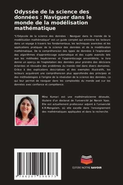 "L'Odyssée de la science des données : Naviguer dans le monde de la modélisation mathématique" est un guide complet qui emmène les lecteurs dans un voyage à travers les fondamentaux, les techniques avancées et les applications pratiques de la science des données et de la modélisation mathématique. De la compréhension des types de données à l'exploration des algorithmes d'apprentissage automatique et des sujets avancés tels que les méthodes bayésiennes et l'apprentissage ensembliste, le livre donne un aperçu de l'exploitation des données pour prendre des décisions éclairées et résoudre des problèmes du monde réel dans divers domaines. Grâce à des explications descriptives et des exemples illustratifs, les lecteurs acquièrent une compréhension plus approfondie des principes et des méthodologies à l'origine de la révolution de la science des données, ce qui leur permet de naviguer dans les complexités du monde axé sur les données avec confiance et compétence.