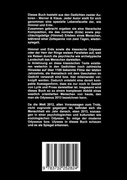 Dieses Buch besteht aus den Gedichten zweier Autoren - Werner & Klaus. Jeder stellt für sich genommen eine spezielle Lebensfacette dar, wie Himmel und Erde. Zusammengebracht ergeben sie aber eine literarische Komposition, die das normale (Erde) sowie psychisch/geistige (Himmel) Erleben eines Menschen, während einer Zeitspanne von zwei Tagen, wiederspiegelt.