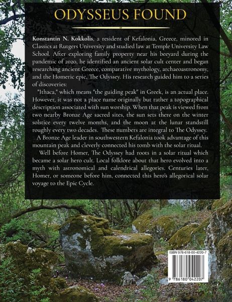 ***NOTE*** Excavation at the site discovered by the author and mentioned in this book has begun as of 2023, after the publication of this book. It promises to be a significant Mycenaean/Bronze Age site. Was there ever an Ithaca or even an Odysseus? This question has been posed for over two millennia. The author believes yes, there was an Odysseus, but "Ithaca" as a place name has likely been misinterpreted. The author did not find the royal tomb by reading Homer's geographical descriptions. The author discovered the tomb by understanding the allegories in The Odyssey that most people overlook. In this book, the author takes the reader on a journey that begins with his recent discovery of a Bronze Age solar cult center in Kefalonia, Greece. Existing research on the Bronze Age follows, which includes a synthesis of the current archaeological record, comparative mythology, and archaeoastronomy. The author reinterprets the design of a nearby Bronze Age cemetery as functioning as a solar calendar, Minoan glyptic art is also reinterpreted, and the solar and lunar allegories of The Odyssey are described. The author then draws comparisons between The Odyssey and the region of Kokolata-Livatho in Kefalonia. Using planetary software (Stellarium) that shows the solar and lunar cycles of the Bronze Age, the sun and moon pointed the way and led the author two kilometers from the solar cult center he previously discovered. That is how the author found what he believes is the royal tomb. The Odyssey before Homer began as a solar hero cult that worshipped a past leader at a specific location in Kefalonia. That leader, Odysseus, cleverly had his tomb built at a unique site to become one with the sun: an immortal solar hero. The ritual evolved into a local myth, eventually spread throughout Greece, and centuries later, a talented bard told his version of the timeless epic we know today as The Odyssey. Includes over 50 illustrations, 38 of which are in color: constellation simulations and landscape photos, as well as the newly discovered sites and the throne at the solar cult center. Konstantin N. Kokkolis is a resident of Kefalonia, Greece. He studied Urban Planning, minored in Classics at Rutgers University, and graduated from Temple University Law School. Decades later, the classes he took in comparative mythology, archaeology, ancient Greek history, and Greek and Roman Art helped him to solve one of history's greatest mysteries.
