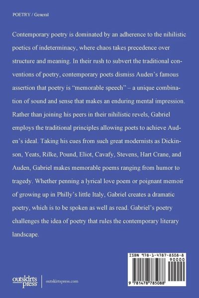Contemporary poetry is dominated by an adherence to the poetics of Indeterminacy, in which tuneless chaos prevails over music and meaning. In their determination to subvert the traditional conventions of poetry, contemporary poets dismiss, in their practice, all the time-honored devices that make poetry, such as, for example, rhythm and rhyme, symbol and song. That is to say, they dismiss Auden's famous formulation that poetry is "memorable speech"-a unique and compelling combination of sound and sense. Rather than joining my peers in their nihilistic revels, my intention, on the contrary, is to employ the traditional practices of poetry to achieve Auden's ideal. Taking that ideal as my own; that is, taking the practice of such great modernists as Dickinson, Robinson, Yeats, Rilke, Pound, Eliot, Cavafy, Stevens, Hart Crane, and Auden, I seek-against the indeterminacy that defines contemporary poetic practice-to make poems memorable for their music and meaning, their sound and sense. Thus, whether attempting a lyrical love poem or a poignant memoir of my growing up in Philly's Little Italy, my intention is to create a dramatic poetry that is to be spoken as well as read, heard as well as seen. Therefore, my poetry stands as a direct challenge to the nihilistic conception of poetry that rules the contemporary literary landscape.