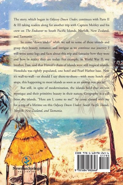 The story, which began in Odyssey Down Under, continues with Parts II & III taking readers along for another trip with Captain Mobley and his crew on The Endeavor to South Pacific Islands, Norfolk, New Zealand, and Tasmania. So come "down under" while we sail to some of these islands and grasp their beauty, romance, and intrigue as we continue our journey. I will write some logs and facts about this trip and fantasize how they were and how in reality they are today. For example, in World War II, my brother, Tim, said that Hawaii's chain of islands were still tropical islands. Honolulu was rightly populated, one hotel and Pearl Harbor base. Now it's wall-to-wall--or should I say shore-to-shore--with more hotels and stops, this happening to most islands as soon as an airstrip was put in! But still, in spite of modernization, the islands hold that ancient mystique and their primitive beauty in their nature. Geography is a call from the islands, "Here am I, come to me!" So come aboard with me for a trip of a lifetime on this Odyssey Down Under: South Pacific Islands, Norfolk, New Zealand, and Tasmania. .