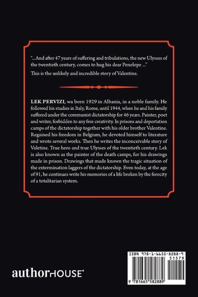 Lek Pervizi, wa born 1929 in Albania, in a noble family. He followed his studies in Italy, Rome, until 1944, when he and his family suffered under the communist dictatorship for 46 years. Painter, poet and writer, forbidden to any free creativity. In prisons and deportation camps of the dictatorship together with his older brother Valentine. Regained his freedom in Belgium, he devoted himself to literature and wrote several works. Then he writes the inconceivable story of Valetine. True hero and true Ulysses of the twentieth century. Lek is also known as the painter of the death camps, for his drawings made in prison. Drawings that made known the tragic situation of the extermination laggers of the dictatorship. Even today, at the age of 91, he continues write his memories of a life broken by the ferocity of a totalitarian system.
