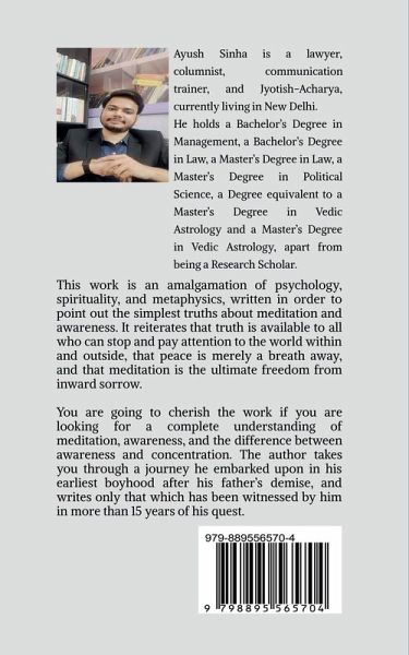 This work is an amalgamation of psychology, spirituality, and metaphysics, written in order to point out the simplest truths about meditation and awareness. It reiterates that truth is available to all who can stop and pay attention to the world within and outside, that peace is merely a breath away, and that meditation is the ultimate freedom from inward sorrow. You are going to cherish the work if you are looking for a complete understanding of meditation, awareness, and the difference between awareness and concentration. The author takes you through a journey he embarked upon in his earliest boyhood after his father's demise, and writes only that which has been witnessed by him in more than 15 years of his quest. Discover the nuances of meditation and understand by yourself how all of us are meditative in one way or another and that love, meditation, and joy are not three different objectives but the by-products of awareness itself.