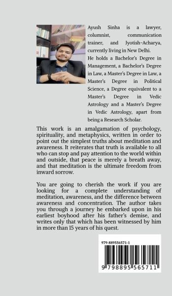 This work is an amalgamation of psychology, spirituality, and metaphysics, written in order to point out the simplest truths about meditation and awareness. It reiterates that truth is available to all who can stop and pay attention to the world within and outside, that peace is merely a breath away, and that meditation is the ultimate freedom from inward sorrow. You are going to cherish the work if you are looking for a complete understanding of meditation, awareness, and the difference between awareness and concentration. The author takes you through a journey he embarked upon in his earliest boyhood after his father's demise, and writes only that which has been witnessed by him in more than 15 years of his quest. Discover the nuances of meditation and understand by yourself how all of us are meditative in one way or another and that love, meditation, and joy are not three different objectives but the by-products of awareness itself.
