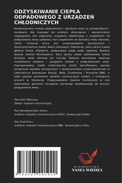 Konwencjonalne metody podgrzewania i odsalania wody s¿ energoch¿onne i kosztowne. Aby rozwi¿zä ten problem, obiecuj¿cym i ekonomicznym rozwi¿zaniem jest po¿¿czenie urz¿dzenia ch¿odniczego z urz¿dzeniem do podgrzewania wody u¿ytkowej i/lub urz¿dzeniem do destylacji wody s¿onawej. Celem niniejszej pracy jest przeprowadzenie teoretycznych i eksperymentalnych badä dwóch domowych ch¿odziarek, które oprócz swojej g¿ównej funkcji ch¿odzenia, podgrzewaj¿ ciep¿¿ wod¿ u¿ytkow¿. Badanie dotyczy równie¿ klimatyzatora, który oprócz swojej podstawowej funkcji destyluje wod¿ s¿onaw¿ lub morsk¿. Badanie teoretyczne obejmuje modelowanie dziäania i sprz¿¿enia lodówki z podgrzewaczem wody. Zaproponowany model matematyczny zostä zweryfikowany poprzez porównanie wyników teoretycznych z eksperymentami przeprowadzonymi w Laboratorium Badawczym Energii, Wody, ¿rodowiska i Procesów ENIG, a tak¿e poprzez porównanie wyników numerycznych modelu z istniej¿cymi pracami w literaturze. Przeprowadzono badania numeryczne w celu optymalizacji geometrii skraplacza spiralnego dedykowanego do procesu podgrzewania wody.