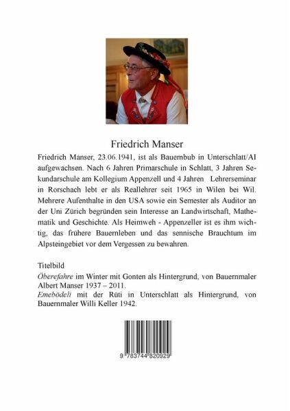 Friedrich Manser, 23.06.1941, ist als Bauernbub in Unterschlatt/AI aufgewachsen. Als Heimweh - Appenzeller ist es ihm wichtig, das frühere Bauernleben und das sennische Brauchtum im Alpsteingebiet vor dem Vergessen zu bewahren.