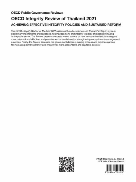 The OECD Integrity Review of Thailand 2021 assesses three key elements of Thailand's integrity system: disciplinary mechanisms and sanctions, risk management, and integrity in policy and decision making in the public sector.
