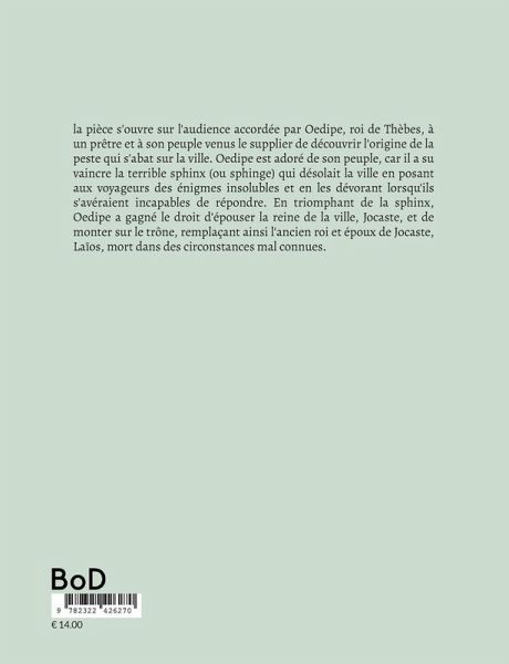 la pièce s'ouvre sur l'audience accordée par Oedipe, roi de Thèbes, à un prêtre et à son peuple venus le supplier de découvrir l'origine de la peste qui s'abat sur la ville. Oedipe est adoré de son peuple, car il a su vaincre la terrible sphinx (ou sphinge) qui désolait la ville en posant aux voyageurs des énigmes insolubles et en les dévorant lorsqu'ils s'avéraient incapables de répondre. En triomphant de la sphinx, Oedipe a gagné le droit d'épouser la reine de la ville, Jocaste, et de monter sur le trône, remplaçant ainsi l'ancien roi et époux de Jocaste, Laïos, mort dans des circonstances mal connues.