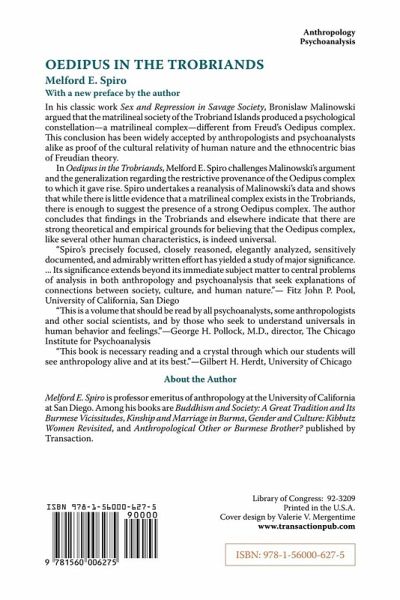 Spiro challenges the argument of Bronislaw Malinowski that the matrilineal society of the Trobriand Islands produced a psychological constellation -- a matrilineal complex -- different from Freud's Oedipus complex and the generalization regarding the restrictive provenance of the Oepidus complex to which it gave rise. Spiro undertakes a reanalysis of Malinowski's data and shows that there is enough to suggest the presence of a strong Oedipus complex. Melford E. Spiro is professor emeritus of anthropology at the University of California, San Diego, where he founded the Anthropology Department in 1968. His other works include Gender and Culture, Oedipus in the Trobriands, and Culture and Human Nature.