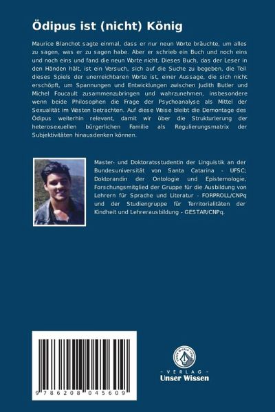 Maurice Blanchot sagte einmal, dass er nur neun Worte bräuchte, um alles zu sagen, was er zu sagen habe. Aber er schrieb ein Buch und noch eins und noch eins und fand die neun Worte nicht. Dieses Buch, das der Leser in den Händen hält, ist ein Versuch, sich auf die Suche zu begeben, die Teil dieses Spiels der unerreichbaren Worte ist, einer Aussage, die sich nicht erschöpft, um Spannungen und Entwicklungen zwischen Judith Butler und Michel Foucault zusammenzubringen und wahrzunehmen, insbesondere wenn beide Philosophen die Frage der Psychoanalyse als Mittel der Sexualität im Westen betrachten. Auf diese Weise bleibt die Demontage des Ödipus weiterhin relevant, damit wir über die Strukturierung der heterosexuellen bürgerlichen Familie als Regulierungsmatrix der Subjektivitäten hinausdenken können.