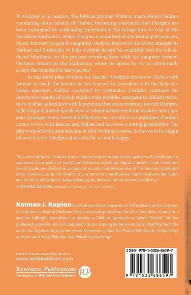 In Oedipus in Jerusalem, the biblical prophet Nathan meets blind Oedipus wandering alone outside of Thebes, becoming convinced that Oedipus has been entrapped by misleading information. He brings him to trial at the Jerusalem Sanhedrin, where Oedipus is acquitted of intentional patricide and incest, but won't accept his acquittal. Oedipus Redeemed describes attempts by Nathan and Sophocles to help Oedipus accept his acquittal, and his self-induced blindness, in the process reuniting him with his daughter Ismene. Oedipus returns to the Sanhedrin, where he agrees to try to emotionally accept the acquittal he has received In this third play, Oedipus the Teacher, Oedipus returns to Thebes with Ismene to teach the lessons he has learned in Jerusalem with the help of a Greek assistant, Kallias, recruited by Sophocles. Oedipus contrasts the destructive results of Greek riddles with parables emergent in biblical narratives. Kallias falls in love with Ismene and becomes rivalrous toward Oedipus, reflecting a distorted Greek view of relations between fathers (older men) and sons (younger men). Several biblical stories are offered as antidotes. Oedipus comes to live with Ismene and Kallias and becomes a doting grandfather. The play ends with the announcement that Oedipus's course is chosen to be taught all over Greece. Oedipus states that he is finally happy. ""It is a tour de force. I wonder if any other active person could write such a work, exhibiting the command of the gamut of Jewish and Hellenistic teachings. Kaplan considers both Greek and Jewish traditions, cloaked in a dramatic context, but focuses mainly on Judaism's profound ideas. Moreover, as he has done in major previous contributions, Kaplan explores the nature and meaning of the Judaic weltanschauung for therapy and the person's wellbeing."" --Daniel Algom, Professor of Psychology, Tel-Aviv University Kalman J. Kaplan is a Professor in the Department of Psychiatry at the University of Illinois College of Medicine. He has received grants from the John Templeton Foundation and the Fulbright Foundation to develop a ""Biblical Approach to Mental Health."" He has published sixteen books and a hundred articles. Among his books are TILT: Teaching Individuals to Live Together; Right to Die versus Sacredness of Life; The Fruit of Her Hands; A Psychology of Hope; and Living Biblically and Biblical Psychotherapy.