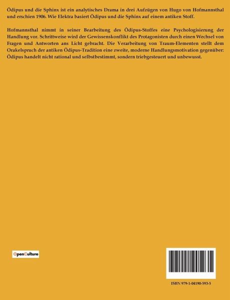 Ödipus und die Sphinx ist ein analytisches Drama in drei Aufzügen von Hugo von Hofmannsthal und erschien 1906. Wie Elektra basiert Ödipus und die Sphinx auf einem antiken Stoff. Hofmannsthal nimmt in seiner Bearbeitung des Ödipus-Stoffes eine Psychologisierung der Handlung vor. Schrittweise wird der Gewissenskonflikt des Protagonisten durch einen Wechsel von Fragen und Antworten ans Licht gebracht. Die Verarbeitung von Traum-Elementen stellt dem Orakelspruch der antiken Ödipus-Tradition eine zweite, moderne Handlungsmotivation gegenüber: Ödipus handelt nicht rational und selbstbestimmt, sondern triebgesteuert und unbewusst.
